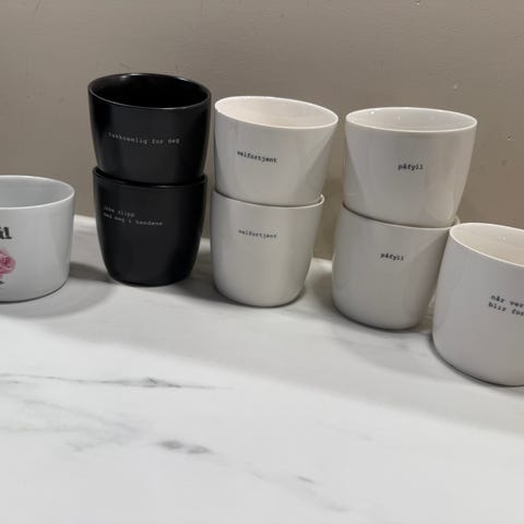 Krus fra Sogne home med 3 forskjellige tekster- 30cl høyde 9 og Ø 9- brukt noen få ganger - ingen skade på koppene og de ser veldig pent ut- strekene på bilde kommer fra lyset- selges samlet- ingen retur- kjøoer betaler frakt- 150kr pr kopp