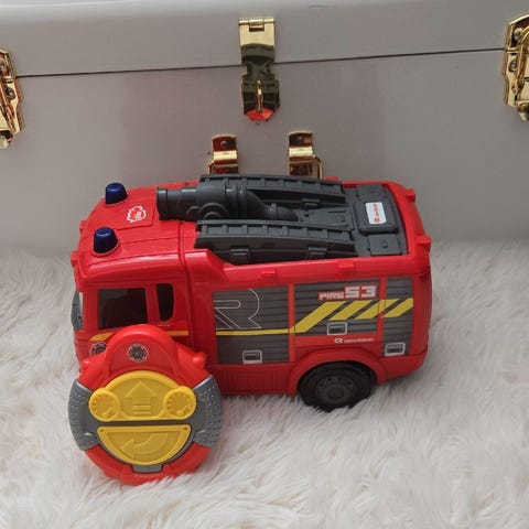 Veldig kult Lekesett bestående av en brannstasjon med helikopterlandingsplass og tre kjøretøy: brannbil, politibil og ambulanse. De gule knappene på taket lager sirene lyder, og lysene på taket blinker. Walkie Talkie på siden fungerer, og barnet kan snakke i den.