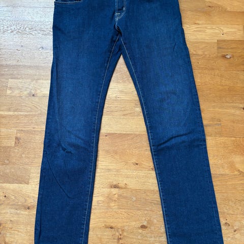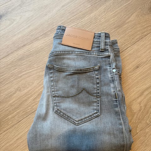 Pent brukt jeans fra Jacob Cohen selges for å rydde plass. Buksen er lagt opp med en drøy tomme fra 34".