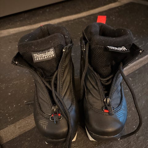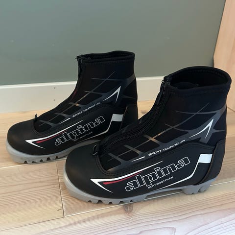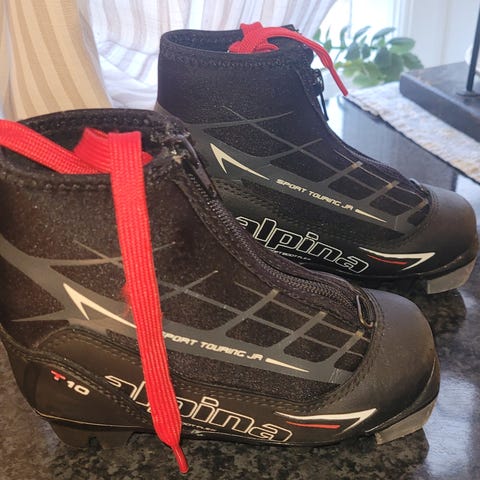 Alpina barn langrennssko i størrelse 30. Skoene har svart farge med røde lisser og glidelås på innsiden. Veldig pent brukt