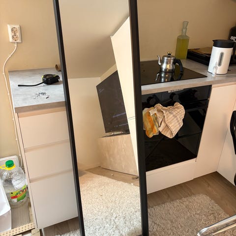 Slitt i kantene på speilet, ellers fint. Gis bort grunnet oppussing.