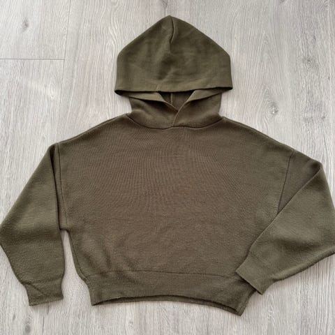Pent brukt grønn hettegenser fra Vila i str. S. Liten splitt nederst i hver side, se bilde. Lengde fra skulder 52 cm. Inneholder 52% viskose, 28% polyester og 20% polyamid. Selges for kr. 75