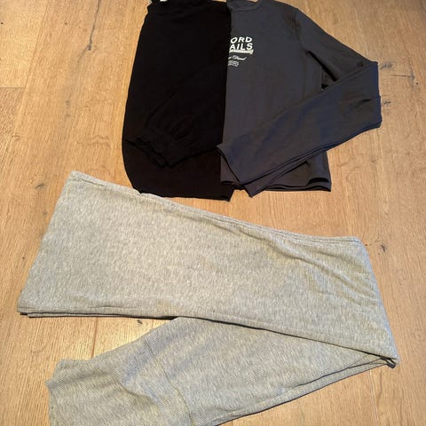 Klespakken inneholder en ytterjakke i teddyfleece, 3 gensere og en bluse. Plaggene er i str 146, 152 og 146/152. Alt fremstår helt og pent, og har ingen hull, flekker eller mangler. Klærne er kjøpt nye, og er brukt av ett barn.