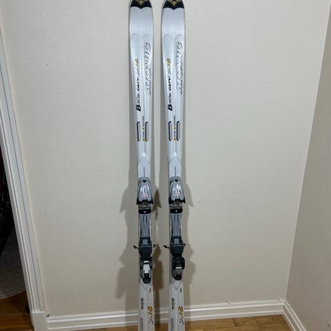 Bindingene ser nærmest nye ut,skiene har noen små riper kan minne om de du får når du står i heiskøer.