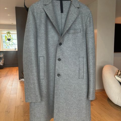 Harris Wharf kåpe i blå ull, størrelse L for herre. Kåpen er laget i ullmateriale og egnet for utendørs bruk. Det er lett og behagelig kåpe