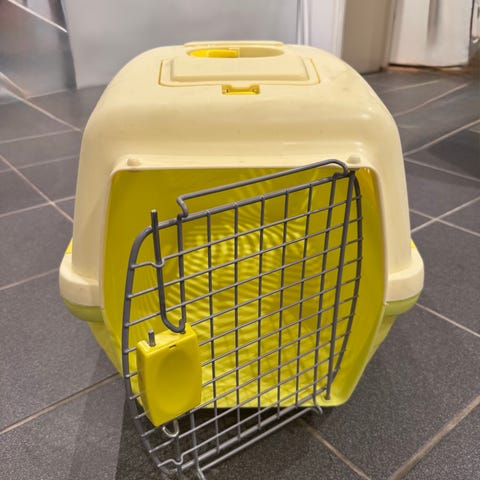 Pent brukt transportbur i solid plast. Passer til katt eller liten hund. God ventilasjon og bærehåndtak. Lett å rengjøre.