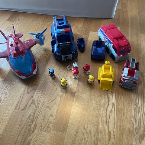 Mange paw patrol figurer, den ene mangler en ben, ellers i fin stand