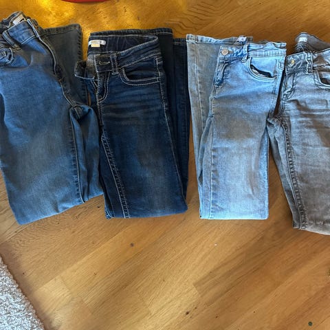 Selger disse samlet til 500 kr. To genser og to bukser. Genserene er i str 146-152. Den grå buksen er i versjonen tall 146, som vil si at den har ekstra beinlengde, og passer likt som den blå som er i str 152