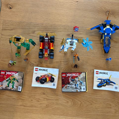 Det følger med byggeinstruksjoner. Settene er pakket ned i poser. Kan ikke garantere at absolutt alle klossene er der, men alt er pent brukt og har stått mest til pynt.