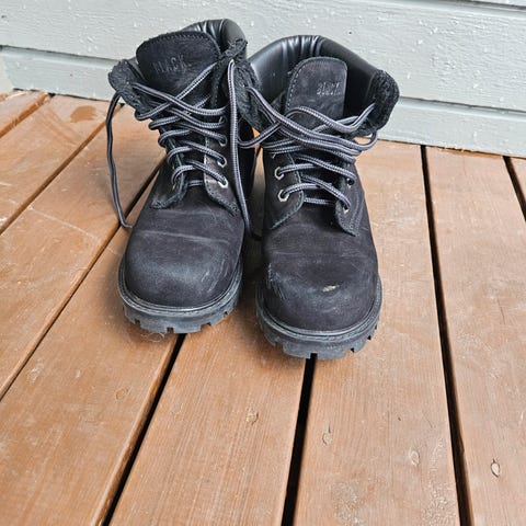 Støvler til litt over ankelen i størrelse 41 laget av svart skinn. Skoene har en spiss tupp og glidelås på innsiden for enkel på- og avkledning.