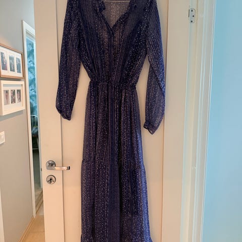 Lang blomstrete kjole. Overdelen er lett transparent og det er en smal åpning i ryggen, se bilde. Brukt noen få ganger.