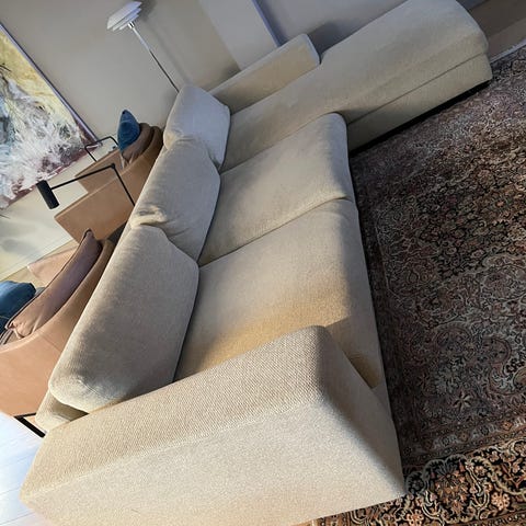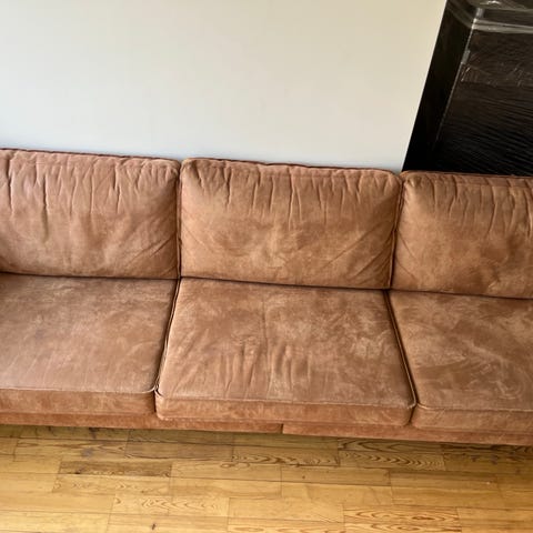 Bolia sofa trukket i lys brun alcantara/mikrofiber. Sofaen har et enkelt og moderne design med rette armlener og lav ryggstøtte.