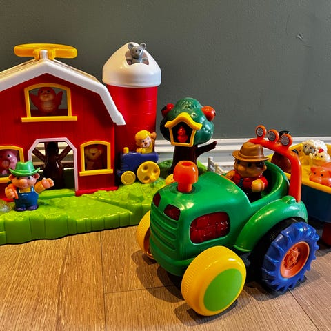 Fisher-Price Little People dyretransportvogn med flere dyrefigurer inkludert zebra, giraff, tiger, elefant og løve. Settet er designet for barn og består av fargerike plastfigurer og en blå vogn med hjul for enkel transport.