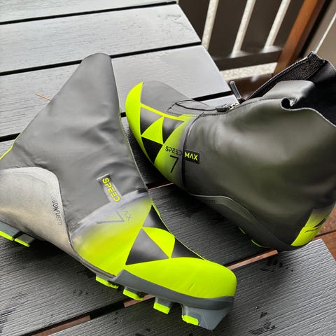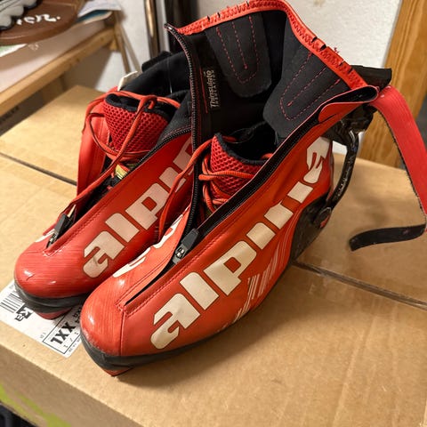 Fine alpina skøytesko i str 42, skoen er i fin stand og har mange mil igjen, fått en liten rift på innsiden av høyre sko, kunn i det ytterste trekket av skoen, så ikke hull gjennom. Kan enkelt limes med tekstillim.