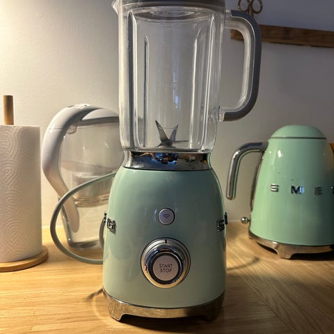 Smeg blender i lyseblå farge med glasskanne og rustfrie ståldeler. Utstyrt med kontrollknapp for justering av hastighet. Designet for kjøkkenbruk.