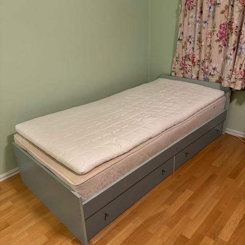 Skeidar enkeltseng for barn🌸med sengebunn i grått stoff. Sengen har ben i metall med gullfarge. Passer til enkeltrom og mindre soverom.må hentes i Slemmestad😊