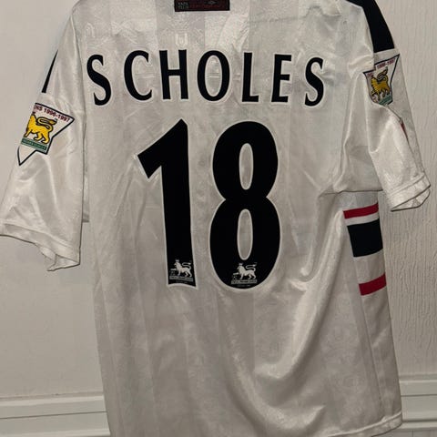 Selger en utrolig flott Manchester United bortedrakt fra 1997-1999 sesongene, i størrelsen Large. Drakten har "Scholes 18"-trykk på ryggen, og "Champions 1996-1997"-patcher på ermene.