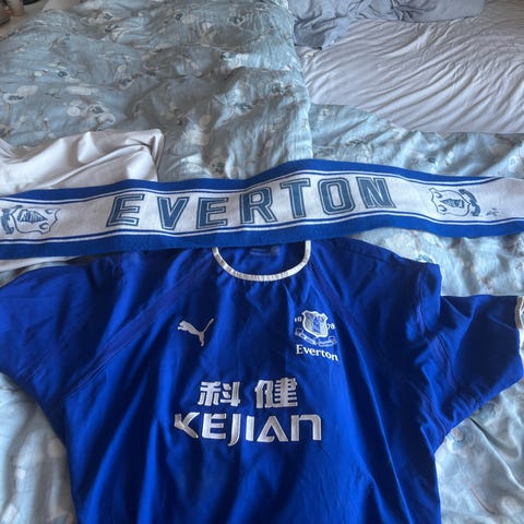 Drakten fremstår i veldig god stand, men sponsormerket "Sharp Viewcam" er dessverre noe falmet i fargen.