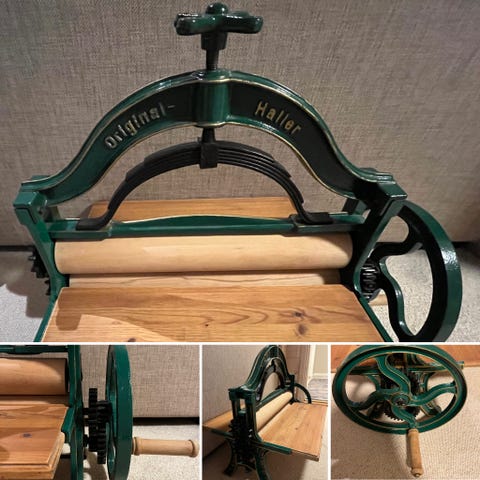 Selger en solid og original Haller klesrulle (mangel) i støpejern med trevalser. Dette er en klassisk, manuell modell av høy kvalitet, produsert av anerkjente Haller.