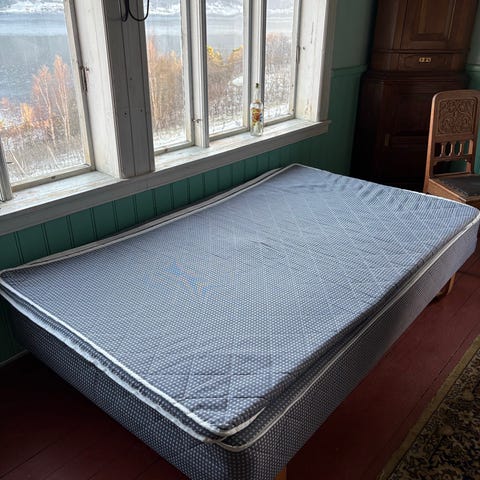Lite brukt seng stått på gjesterom.Dette er robust rammemadrass fra Møbelringen, modell Base med Bonell-fjærer.