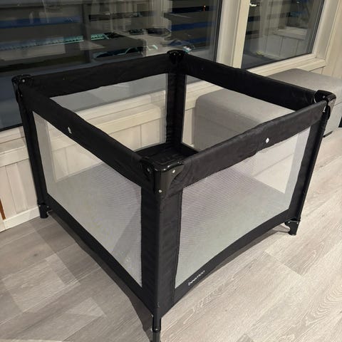 Selger pent brukt lekegrind. Kan legges sammen, følger med oppbevaringspose. Tekstilet kan vaskes.