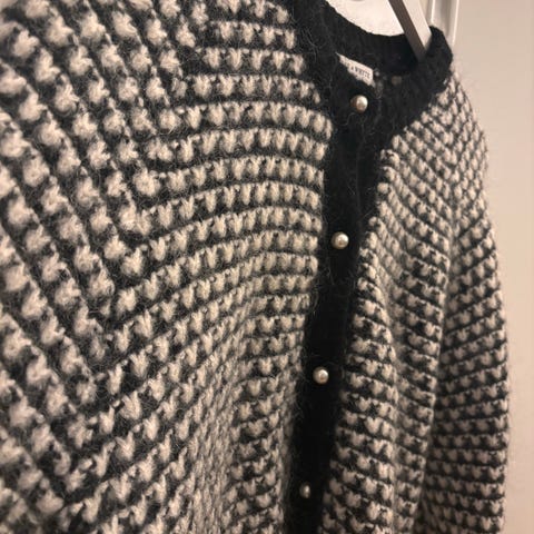 Lindex cardigan i størrelse M for dame, laget av merinoull, viscose og Chashmere Cardiganen har svart og hvit farge og er designet for å gi varme og komfort.