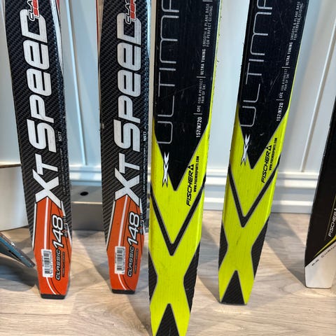 Rossignol R-8 langrennsski med en lengde på ca.185cm. Skiene har et rødt, blått og hvitt fargemønster. Leveres med staver ca 155cm.Egnet for langrenn.