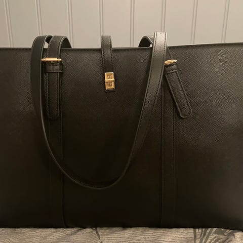 Veske/skulderveske med mønster med blå og hvite detaljer.