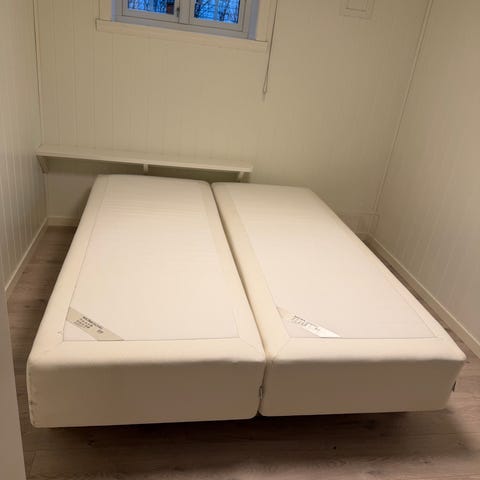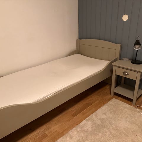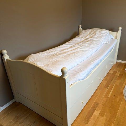 IKEA seng med tre oppbevaringsskuffer under sengen. Sengen er hvit og laget av tremateriale. 90 bredde, kan dras ut til dobbeltseng. To enkle madrasser følger med. Noen kosmetiske småskader. Må hentes og evt demonteres av kjøper.
