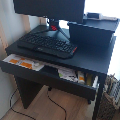 Fint skrivebord fra IKEA. 3 heltre skuffer. Skyvbar hylle for tastatur eller laptop.