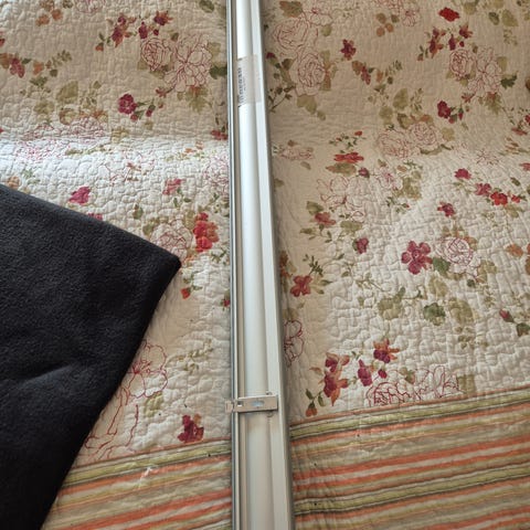 Lamellgardin i beige farge med lameller på 89 mm bredde. Gardinen har en bredde på 150 cm og en høyde på 250 cm.