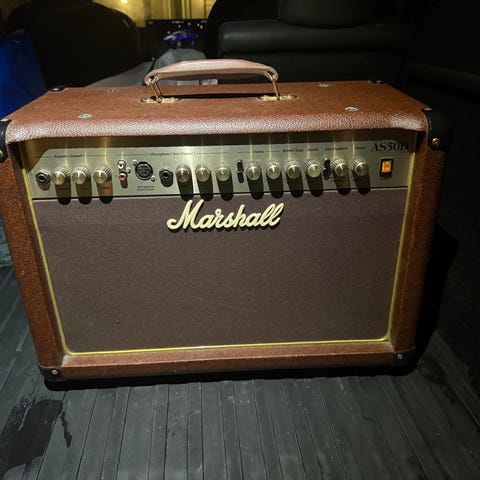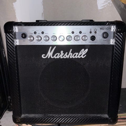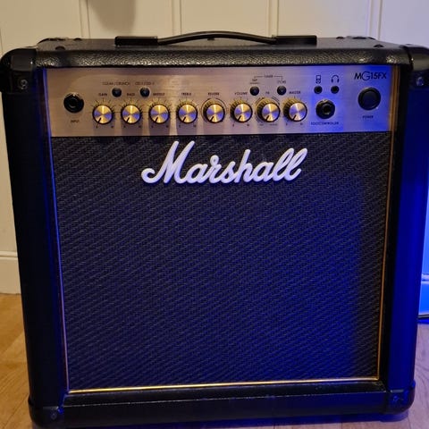 Marshall MG15 gitarforsterker med svart kabinet og gullfargede kontroller. Forsterkeren har flere justeringsmuligheter for lyd og er egnet for gitarbruk. Selger pga lite brukt.
