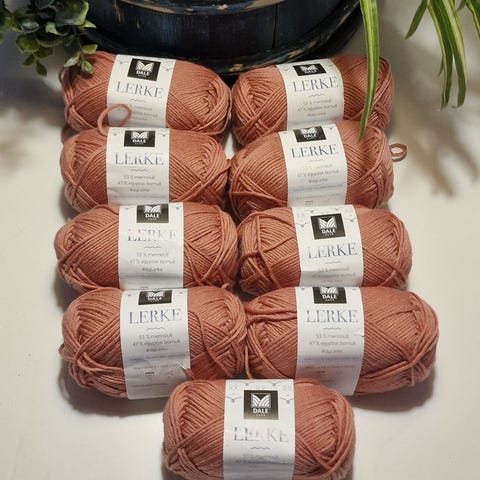 19 stk Dale Lerke garn i fargen rosa. Hver nøste veier 50 gram. Garnet består av merino egnet for strikking og andre tekstilprosjekter.