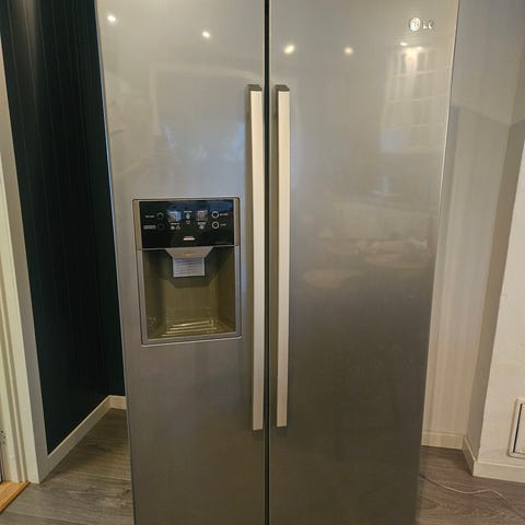 Lg Side-by-Side kjøleskap med to dører som gir god oversikt og tilgang til matvarer. Designet for kjøling og frysing i separate seksjoner, egnet for husholdninger som ønsker stor lagringskapasitet.