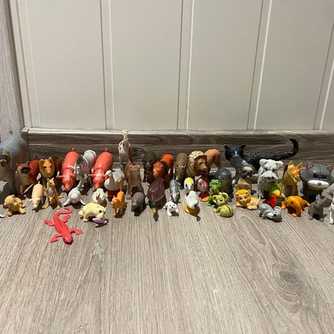 Samling av diverse dyrefigurer laget i plast og stoff. Figurenes størrelse og design varierer, og de inkluderer både ville og tamme dyr. Egnet for lek eller samling.