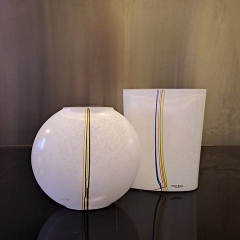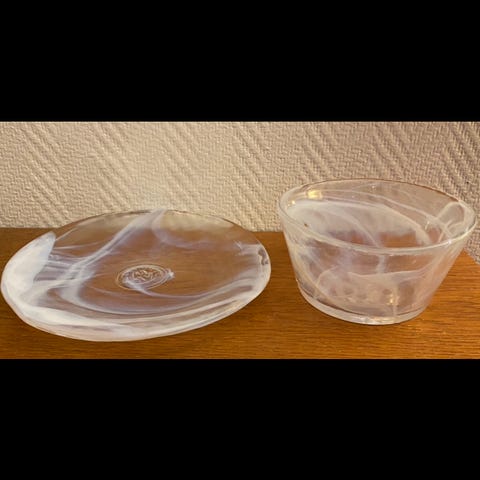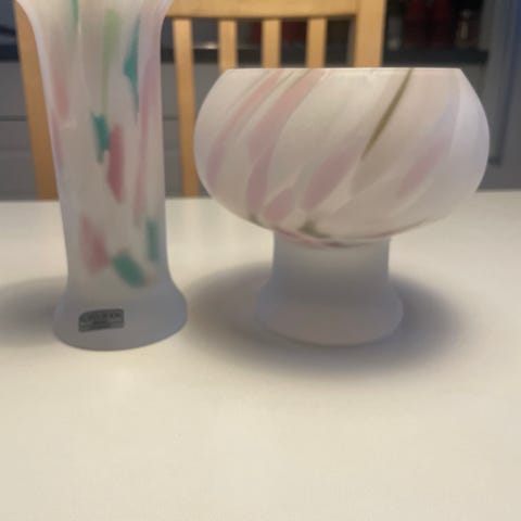 Selger en dekorativ og håndmalt skål fra Kosta Boda. Skålen har en vakker bølget form i frostet glass med blå dekor og små gule detaljer. Klassisk skandinavisk kunstglass.