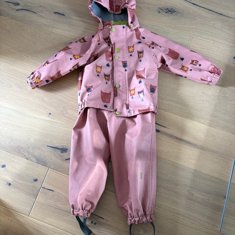 Pent brukt regntøy fra Kattnakken, modellen plask i lilla. Brukt av ett barn i en sesong☺️ Veldig godt regntøy som holder barnet helt tørt, selv på de våteste dagene!