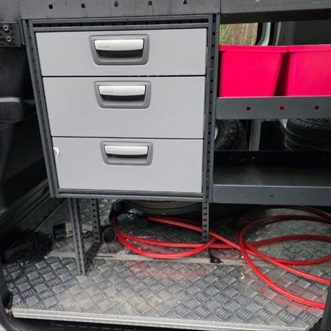 Verktøyinnredning for varebil med skuffer og oppbevaringsbokser