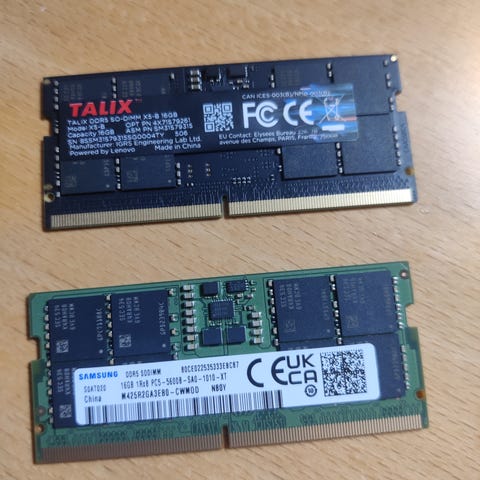 2 stk Samsung SO-DIMM 8GB DDR5 4800MHz. Brikkene stod i en bærbar PC som ble oppgradert når jeg kjøpte den. Brikkene er så og si ubrukt.
