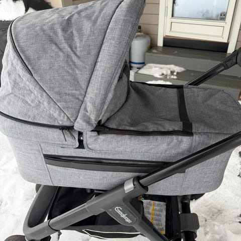 Liggedel er pent brukt. Stor liggedel som rommet vinterpose og baby på 6mnd. Insektsnett og solskjerming kan festes på kalesje. Liggedel kan bæres etter håndtak på kalesje. Trekk følger med.