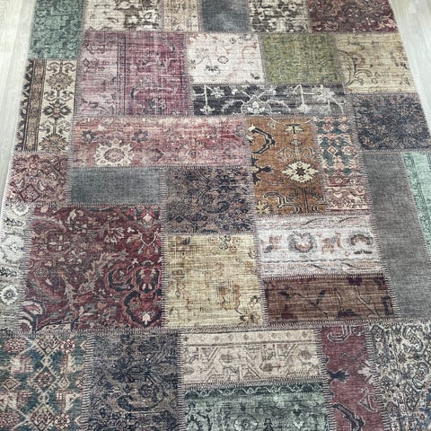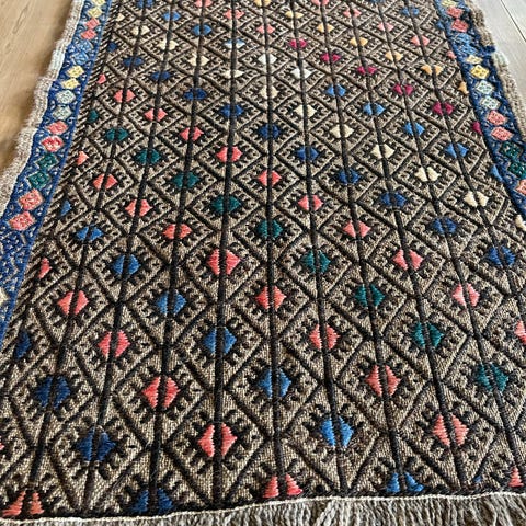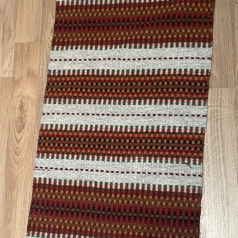 IKEA teppe med geometrisk mønster i flere farger, inkludert blå, rød, beige og brun. Teppe med frynser i kantene, laget av ull