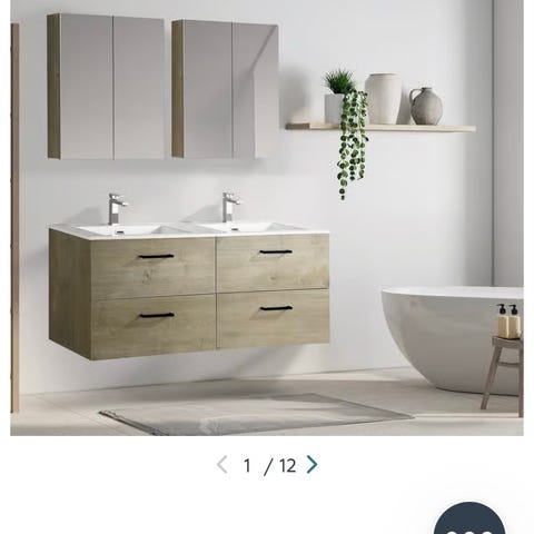 Baderomsmøbel med dobbel servant og speilskap hvit