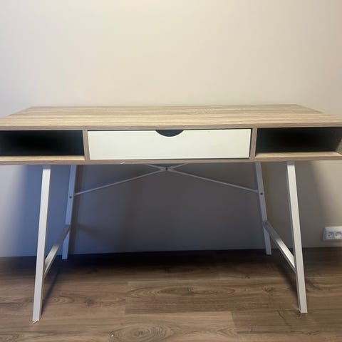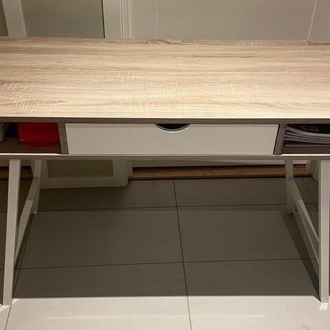 I god stand med noen små bruksmerker i bordplata (se bilde og zoom). Usynlig under et skrivebord-underlag ;). Selger også Snille kontorstol som passer til, kun kr 150,-