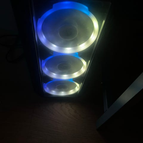 Stasjonær gaming-PC utstyrt med RGB-belysning på flere vifter. PC-en har et transparent sidepanel som viser interne komponenter og belysning. Passer for brukere som ønsker en kraftig maskin med visuell effekt.