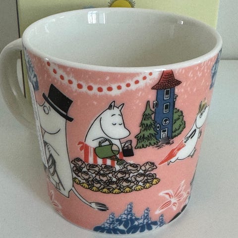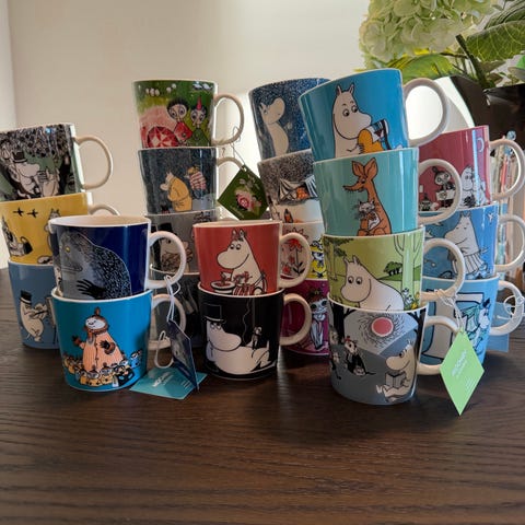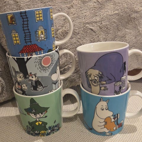 Arabia og Muurla Mummi kopper med ulike Mummi-motiver. Settet inkluderer kopper i flere farger og design, laget i emalje og porsjonen.