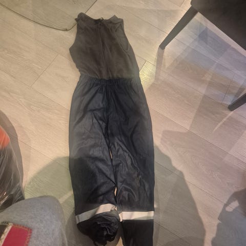 Fin regnjakke til våte dager. Brukt av åtte-åring. Fikk en liten rift i ryggen som er tettet med selvklebende beskyttelses-tape. Fungerer godt.