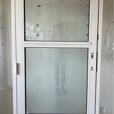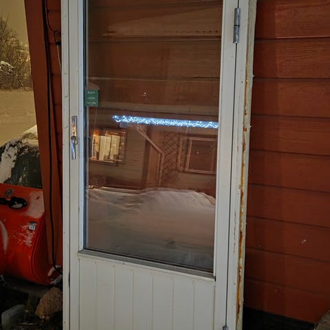 Ny, venstrehengslet dør fra utsiden. Den som selges er høyrehengslet