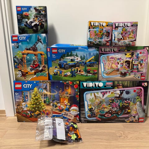 LEGO Friends byggeklosser og sett med ulike deler, inkludert hus, kjøretøy og figurer. Settene inneholder flere instruksjonshefter og ulike farger og materialer typiske for LEGO Friends-serien.