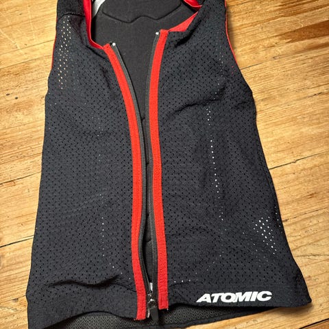 Atomic ryggbeskytter med stropper i svart og rød farge. Designet for å gi beskyttelse til ryggen under aktiviteter som krever ekstra sikkerhet.
