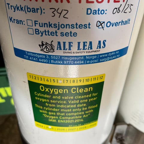 Selger ett D12/dobbel 12 flaskesett, trykkprøvd sist 2022. Ingen anmerkninger på trykkprøving i mitt virke. Ikke brukt siden da. Stått mørkt og kjølig.
